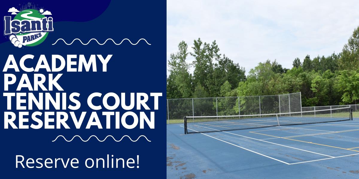 The tennis court is generally available during park hours. While Academy Park also features a playground shared with the adjacent Arts and Science Academy (which is off-limits to the general public during academy hours), the tennis court typically remains available for public use and reservations. Online reservations are accepted through the City of Isanti's online system. (Look for "Park Rental" under the "Type" filter when searching for dates).