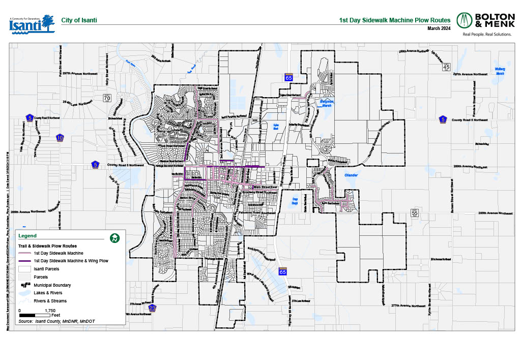 Please note - as of Feburary 5th 2014, all the public sidewalks within the city are cleared by the city of Isanti Public Works Department. They are cleared on a primary or secondary schedule given the streets have been cleared. Further removal of nuisance ice and/or snow on that sidewalk shall be the responsibility of the adjacent property owner and shall be removed within 48 hours from the date of notification by the City.
